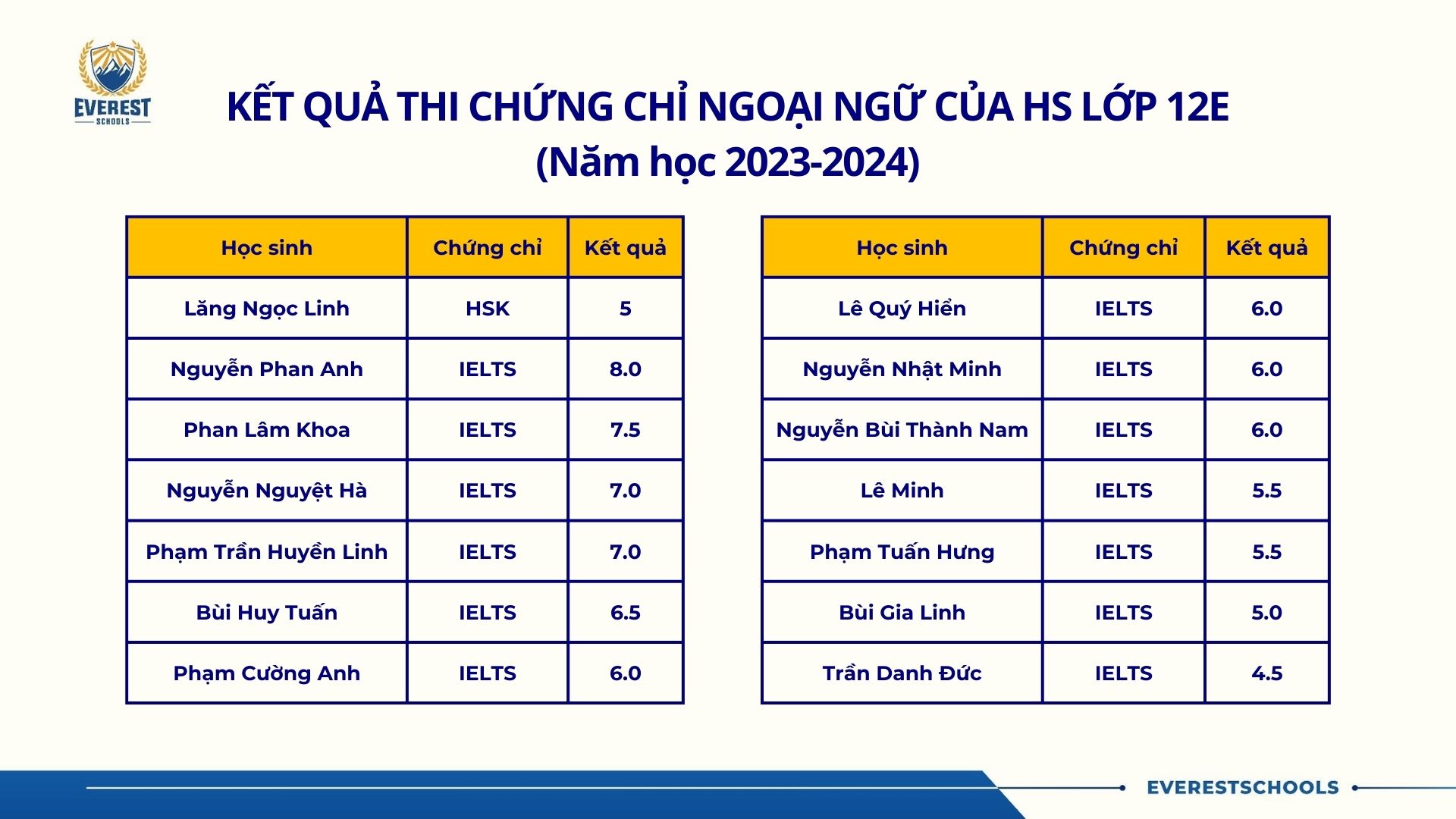 Năm học 2023-2024, Lớp 12 (niên khóa 2021-2024) tốt nghiệp THPT Everest với 30% học sinh được tuyển thẳng vào các trường đại học danh tiếng trong nước và quốc tế cùng kết quả chứng chỉ ngoại ngữ đáng tự hào.