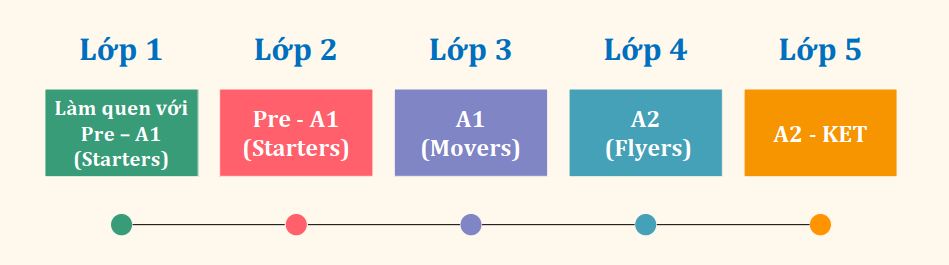 Lộ trình đào tạo được ban chuyên môn và tổ Tiếng Anh của nhà trường phân bổ khoa học, phù hợp từng Khối lớp. Ngay từ lớp 1 các học sinh được làm quen Tiếng Anh, lớp 2 các học sinh học chương trình Pre A1, lớp 3 học chương trình Starter A1, lớp 4 Movers A1, và lớp 5 chương trình Flyer A2.
